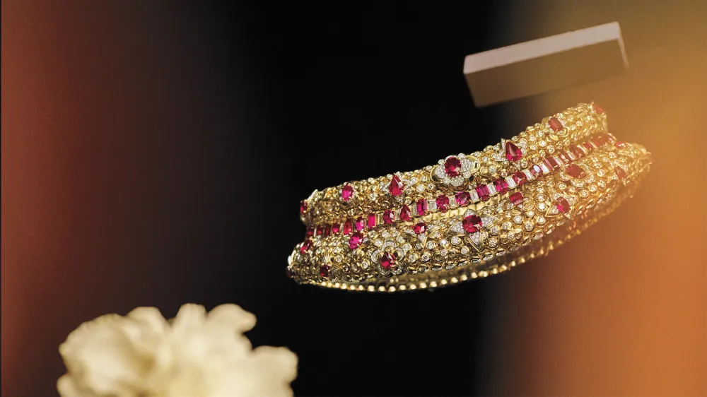 Color, color, color! Word on the street is colored stones are becoming increasingly important to serious collectors and the high jewelry houses in Paris certainly deliver with a much needed dose of vibrancy. Van Cleef & Arpels flexes its stone-setting skills in its Traversée Mystérieuse bracelet decked in rich sapphires accented with diamond edges, while rubies drip all over Louis Vuitton’s opulent Splendeur collar necklace. Meanwhile, Pomellato chose the rainbow. The house mixes a multitude of collars from green peridots, blue tanzanite to soft pink morganite and more, all featuring seriously collectible stones. While some come in intricate settings, others let the stones speak for themselves. Either way it placed an emphasis on the fact that collectors are leaning toward gems that are rich in color and significance. Above: Louis Vuitton Splendeur necklace in 18-karat yellow gold and platinum set with rubies and diamonds. All prices upon request. Piaget transformable cuff bracelet in 18-karat pink gold set..